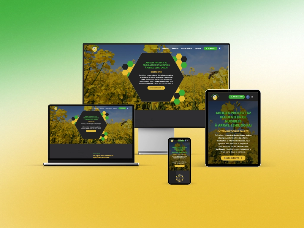 Nous avons accompagné Abeilles Protect 62, entreprise spécialisée dans la régulation de nuisibles et la récupération d’essaims, dans la création complète de son site internet vitrine. L’objectif était de construire une plateforme claire, épurée et rassurante, mettant en avant à la fois les services de désinsectisation (guêpes, frelons, cafards…), la dératisation, la vente de miel, mais aussi leur engagement en faveur de la sauvegarde de l’abeille noire. Le tout avec une expérience utilisateur optimisée et une navigation fluide.